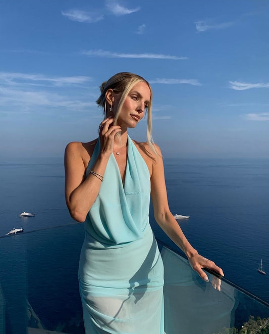 BENNI NICO OFF SHOULDER MAXI DRESS IN AQUAMARINE SIZE 8