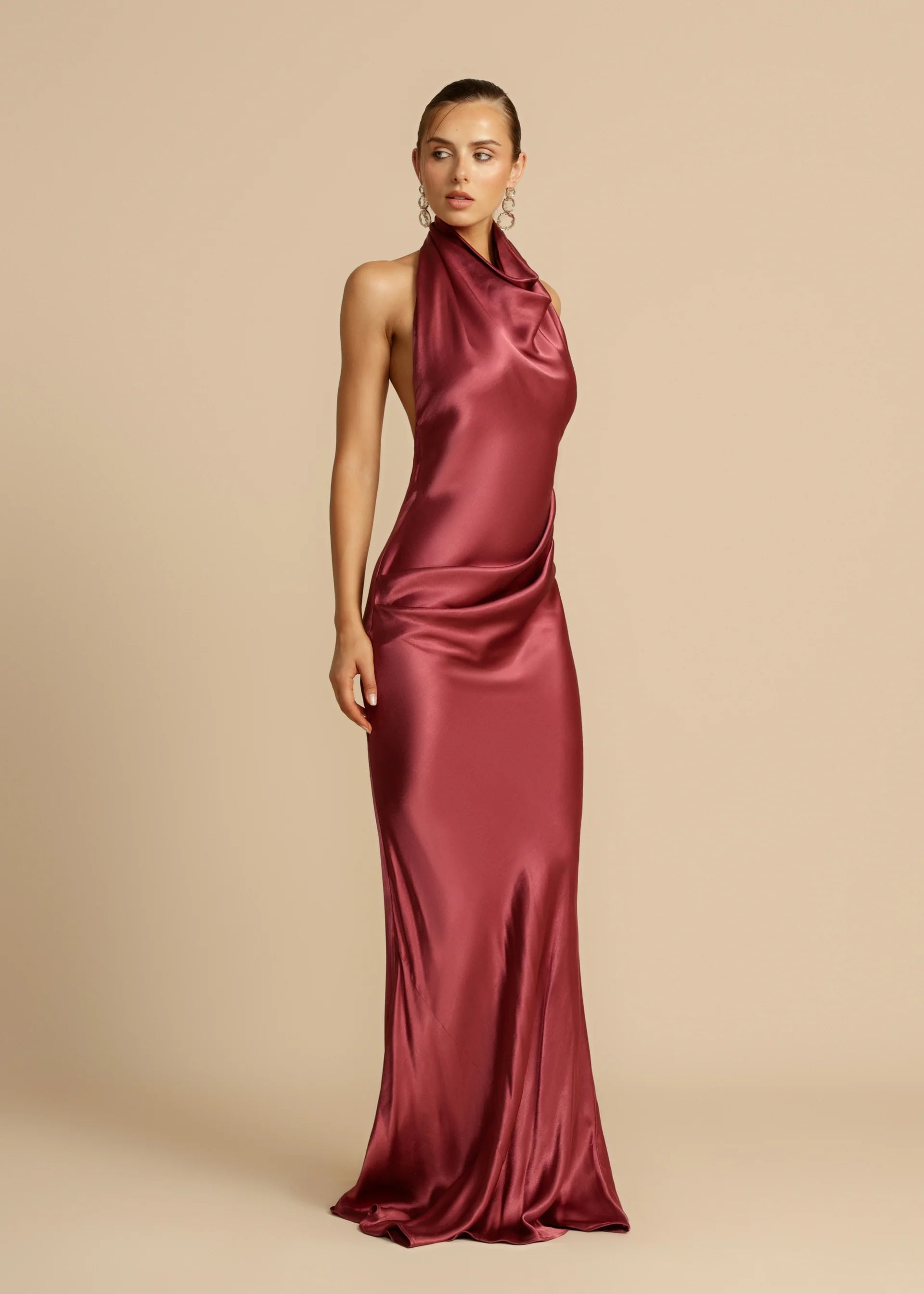 The Gaia Dress in plum is a floor-length statement piece designed for modern elegance. Made from a soft, high-quality viscose, it features a sophisticated cowl neckline and a striking open back that adds allure. Cut on the bias for a flattering drape, the dress skims the body and falls beautifully over the hips. Hire the Gaia Dress to turn heads with effortless sophistication.