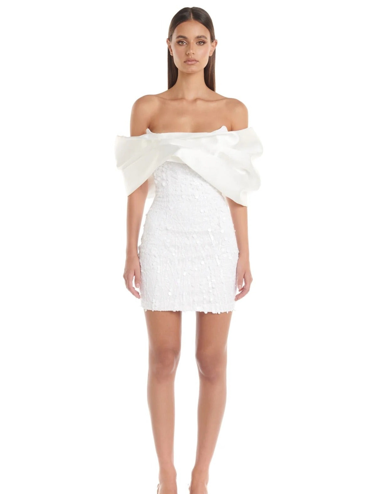 Here to make a statement, the Bianca Dress, designed in an embellished white sequin fabrication features a mini slim fit style silhouette with an accentuated off the shoulder detail. Modern and alluring, this mini is complete with lining and an exposed silver zipper at the centre back. Bianca will be sure to turn heads at your next special occasion! Where to wear: Engagement party, bridal shower, hens celebration, baby shower, cocktail party, wedding rehearsal dinner, birthday celebrations and other special occasions.